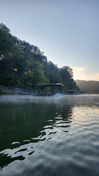 Beautiful modern and clean interior, cozy cabin. Very well equipped kitchen. Sleeps 8 if you can get by sharing one bathroom. Multiple very nice to use outdoor living spaces. I counted 181 stairs down the side of the bluff to the dock, but there are multiple landings and even a bench half way down to take a breather. The stairs are steep but hand rails sturdy and in good repair. The dock is in a quiet cove with glass water, about 3 minutes by boat to Turkey Creek boat launch (15 minutes driving). The kayaks, lily pad, and jet ski dry dock were added bonuses. Fishing off the dock was not especially prolific but could reasonably be chalked up to my choice in rigging. Our host was so responsive and truly did everything to make sure our stay was excellent. We plan to be back next year!