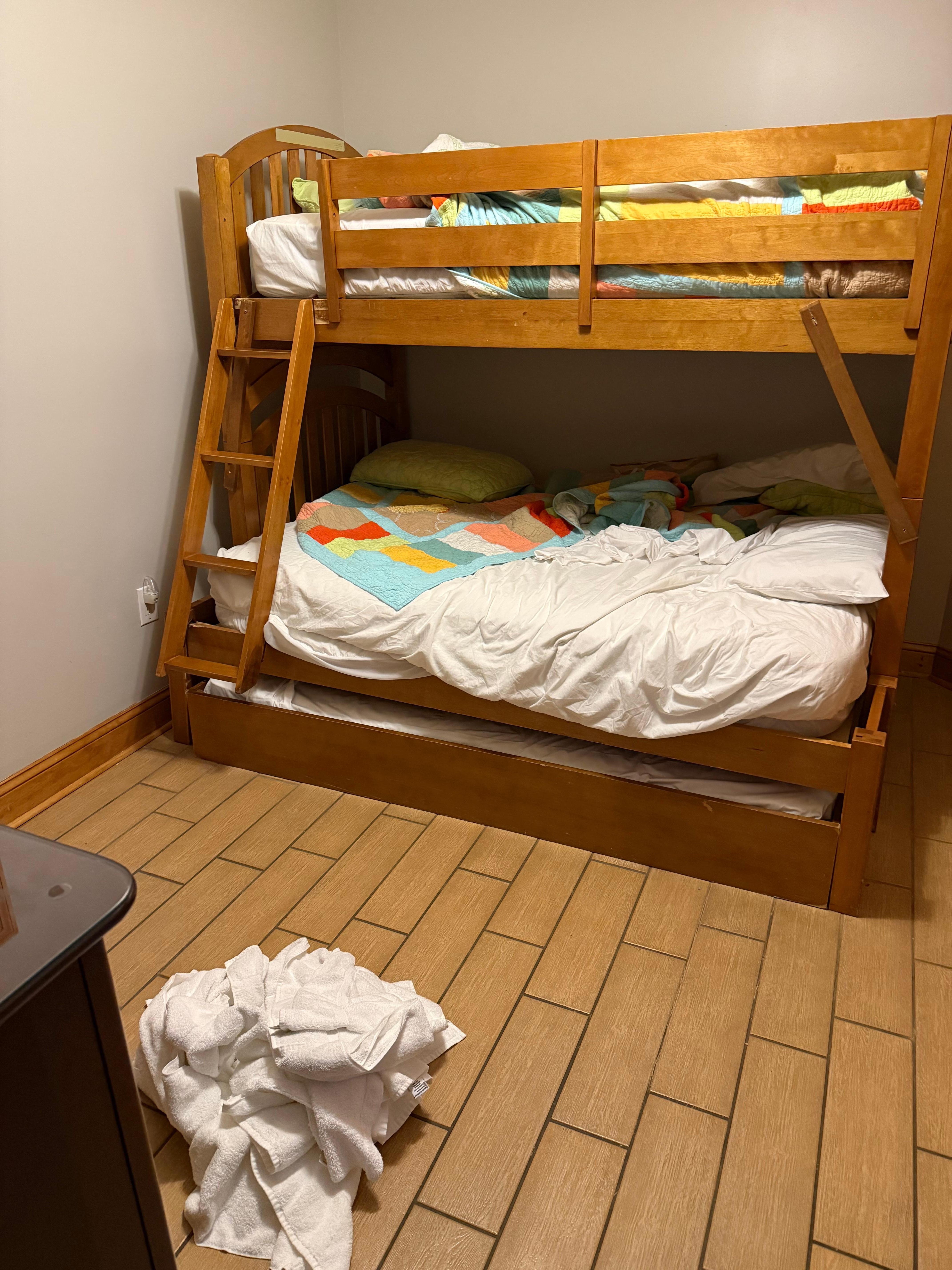 The primary suite features a king-size bed, flat-screen TV, elevated ceilings, and a private en suite bath with a jetted tub, walk-in shower, and single sink vanity. Two guest bedrooms—one with a queen bed, the other with a twin over double bunk bed—each have flat-screen TVs and share a Jack and Jill bathroom with a shower and single vanity.