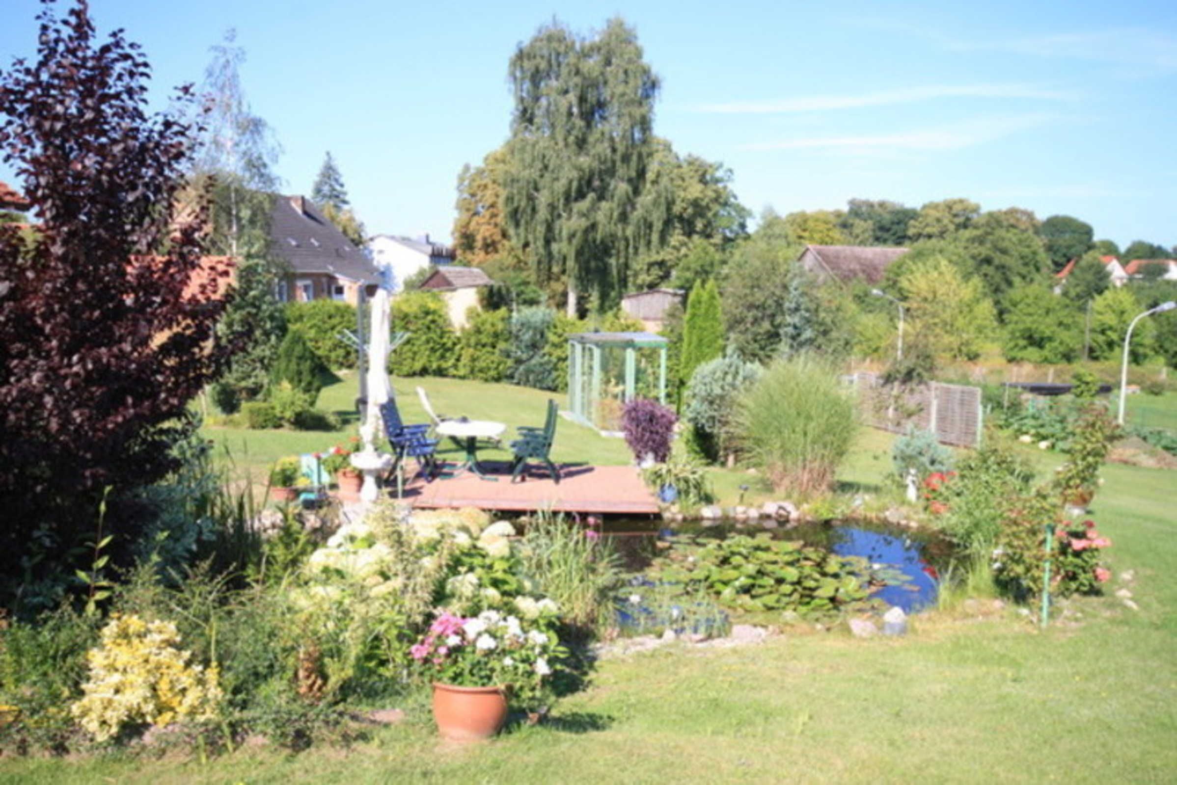 The holiday apartment with separate access is located on the ground floor of a detached holiday home on a 1700 square metre, separate and completely fenced recreational plot on the quiet outskirts of the village. A second holiday apartment within the house is only occasionally used privately by the owner. The holiday apartment is equipped with a living room with upholstered furniture including sofa bed, seating and dining area, TV and radio and a bedroom with double bed. Furthermore, the apartment is equipped with a kitchen with electric cooker with oven, fridge with freezer, microwave, dining table and various kitchen utensils as well as a bathroom with shower and toilet. The apartment also has central heating, a furnished terrace, barbecue, bicycle storage and a car park. A 4-seater canoe can be hired (for a fee). The total price includes bed linen, towels, water and energy consumption. To be paid on site: Tourist tax (April-October).