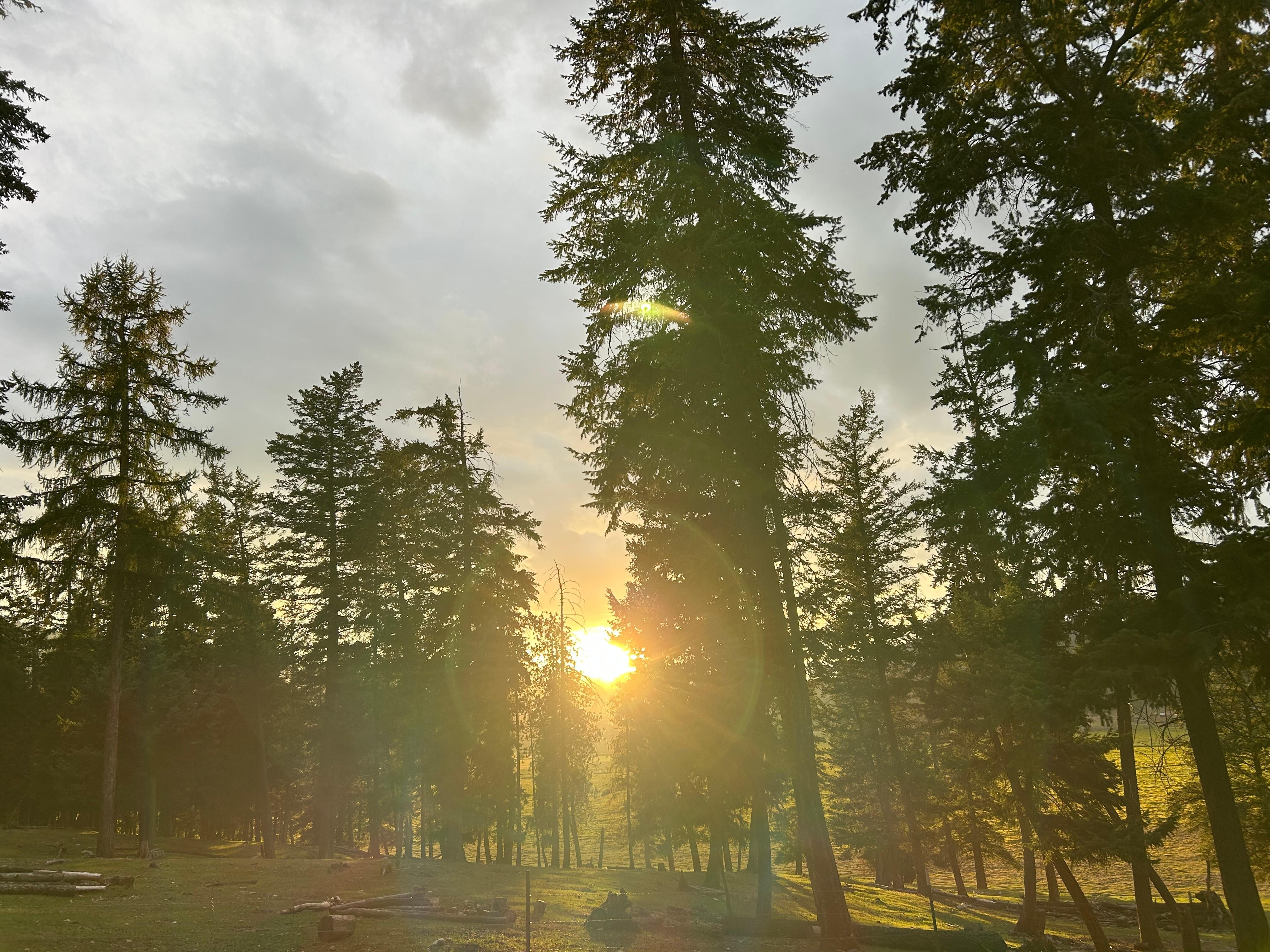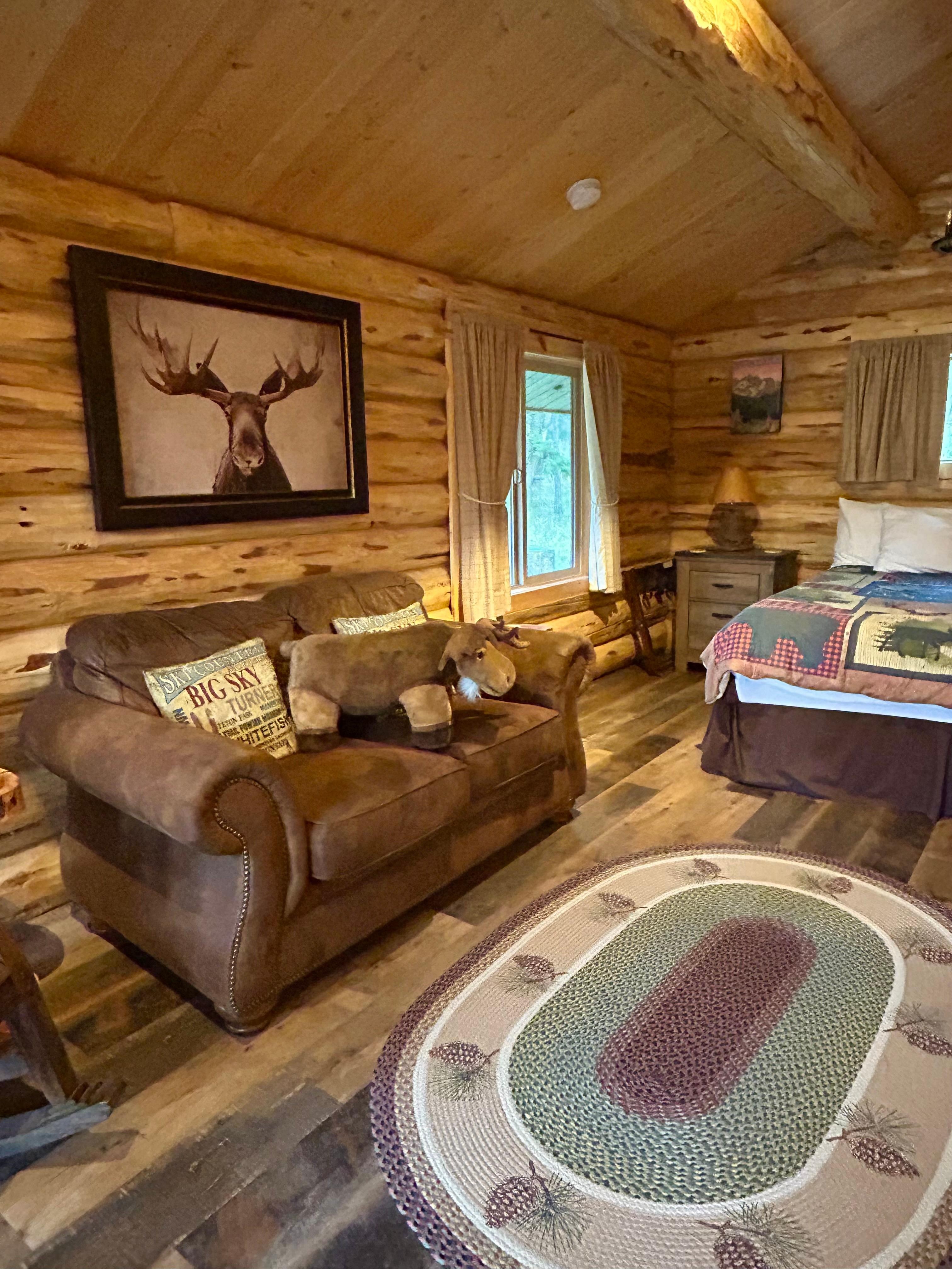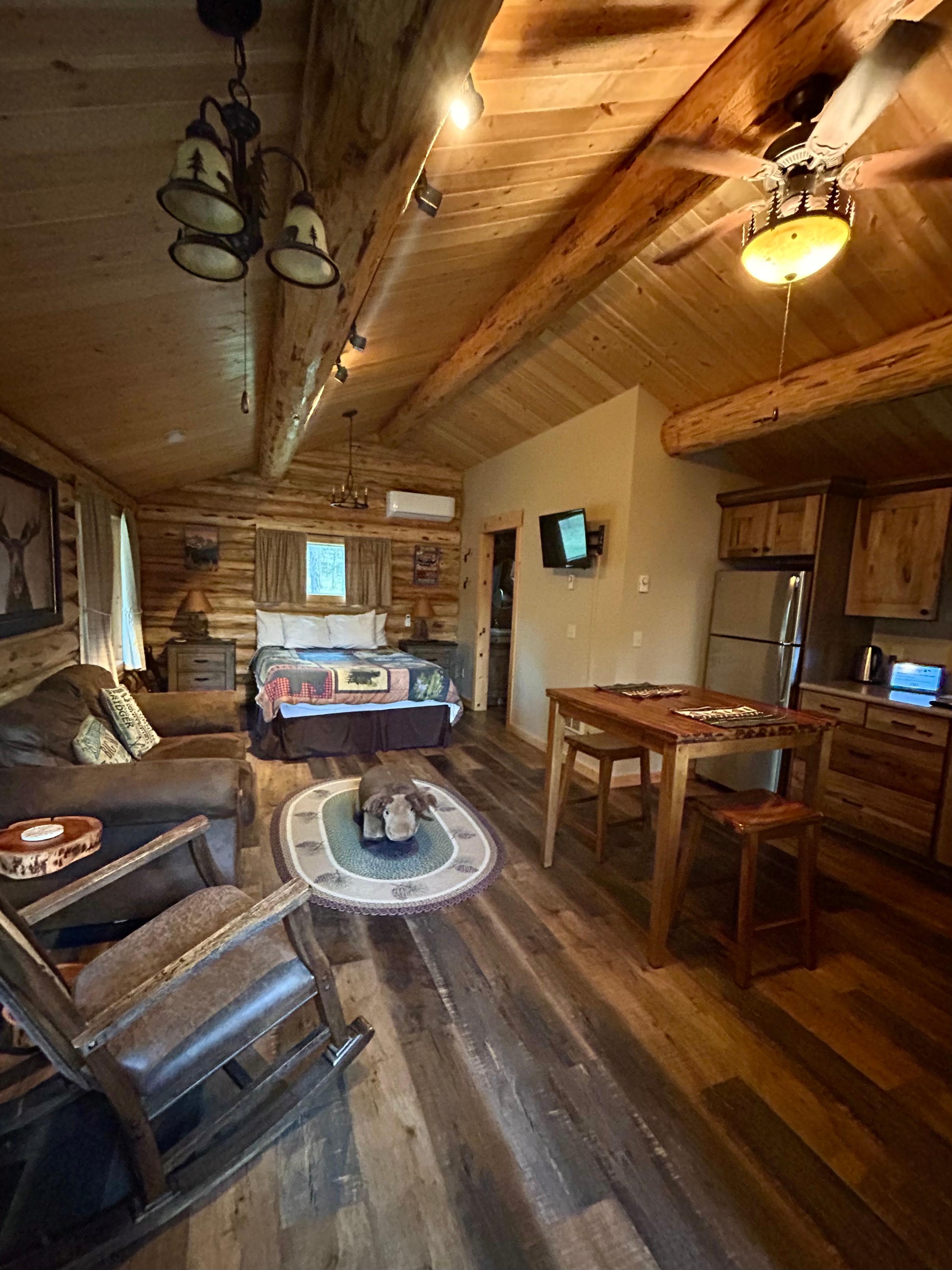 If you are looking for an authentic log cabin in the woods of Montana, this is the place for you! We have three log cabins on our organic cattle ranch out in the country and away from it all, yet you can drive on all paved roads to Kalispell in only 20 minutes (13.5 miles), Whitefish in 35 minutes (27 miles), or to the west entrance of Glacier National Park in about an hour. Our cabins are hand crafted by the local Amish and have all you need for a cozy and comfortable escape including AC for those hot summer days, and an on-site laundry. You will enjoy the convenience of a kitchenette, a small table for eating, a seating area, a queen bed, and a full bathroom. The kitchenette includes a fridge/freezer with an ice maker, microwave, toaster, coffee maker with a reusable filter, and a 2-burner induction cooktop.