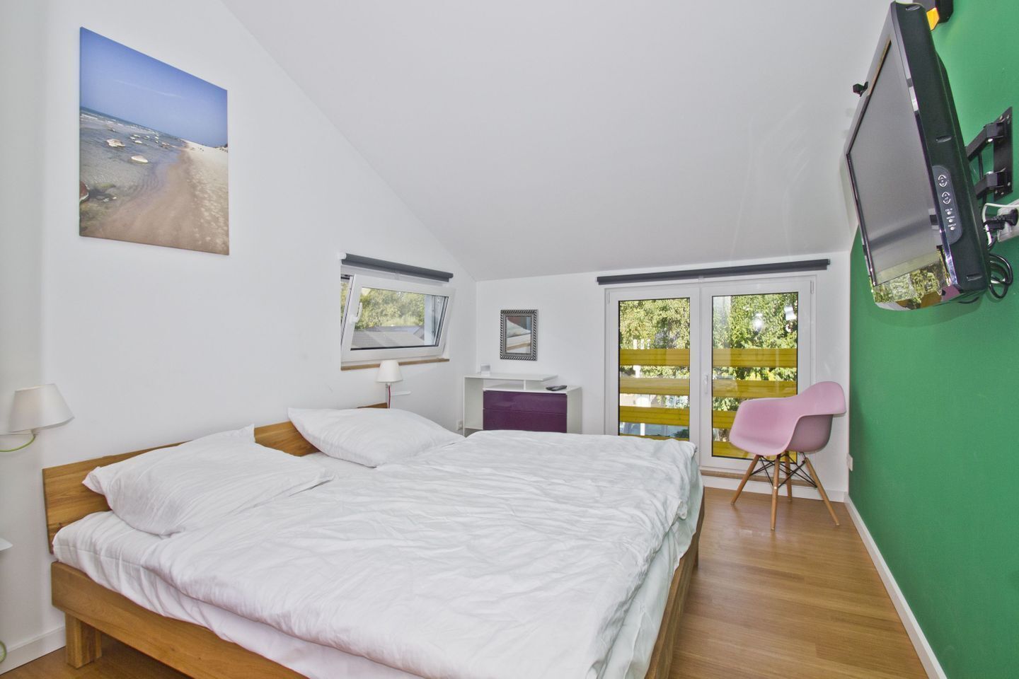 The bedroom with the comfortable double bed (160x200cm) also offers you a home office corner for working and vacationing. There is also a single bed (80x200cm) for a child.