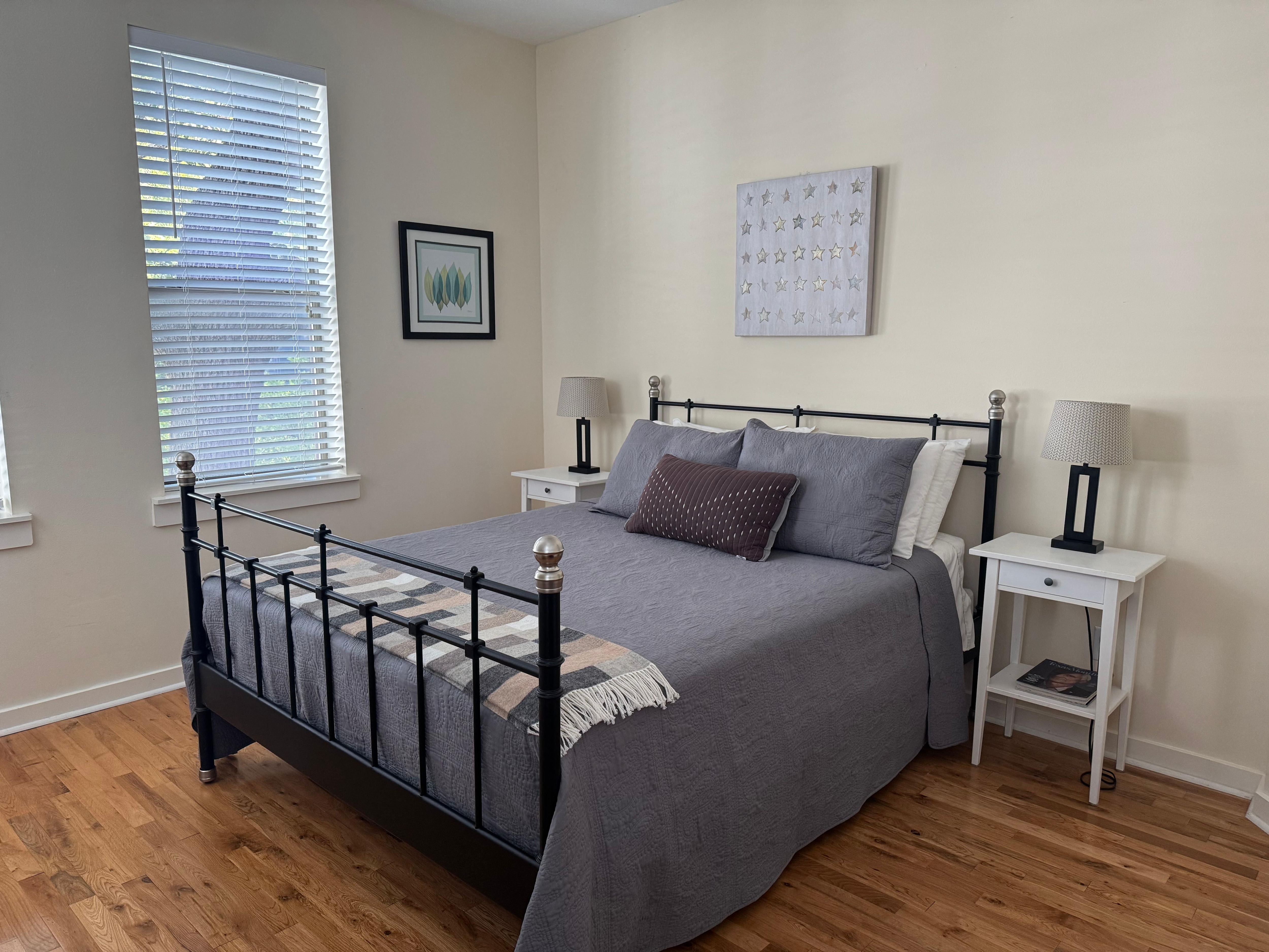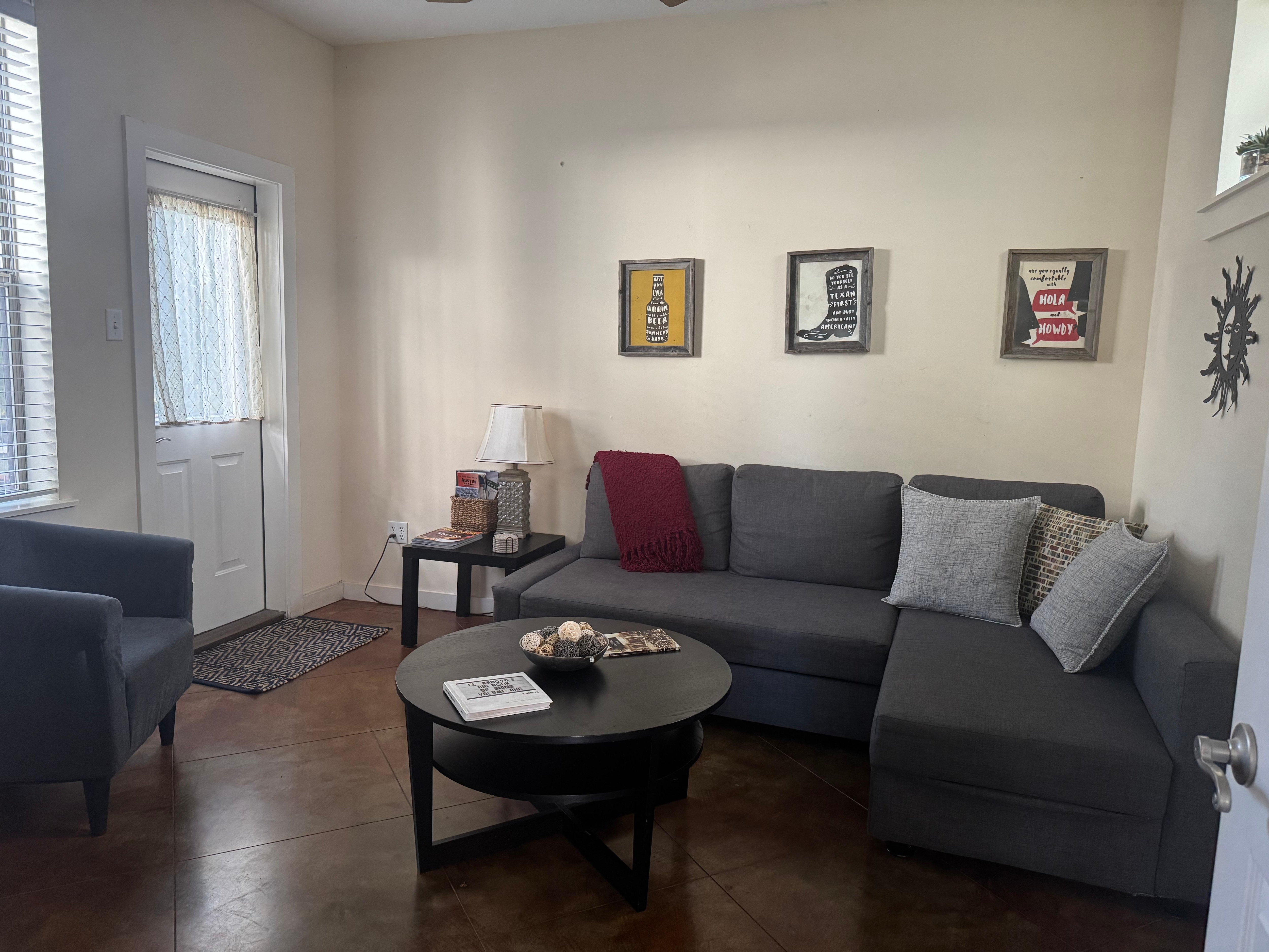 Hermosa casa adosada ubicada entre imponentes robles vivos. 2 dormitorios, cada uno con una cama queen size, 2 baños y un sofá cama doble en la sala de estar. Duerme seis cómodamente. Pequeña terraza de la sala de estar con mesa y sillas. Impresionante terraza en la azotea con vistas al Capitolio. Cocina comedor con estufa, refrigerador, lavaplatos, cafetera, licuadora, tostadora y todos los platos, cristalería y utensilios. Puede combinarse, en espera de disponibilidad, con Eleven Oaks Suite para proporcionar alojamiento para ocho personas. Sus anfitriones, Janelle y Ted, están de guardia para satisfacer cualquier necesidad. Eleven Oaks Townhouse es una propiedad estrictamente para no fumadores. Está prohibido fumar en cualquier lugar de las instalaciones, dentro y fuera. Eleven Oaks Townhouse no es una casa de fiestas STR. La ocupación está limitada a seis. Se prohíbe la reunión de personas además de los inquilinos sin el permiso expreso de los anfitriones.