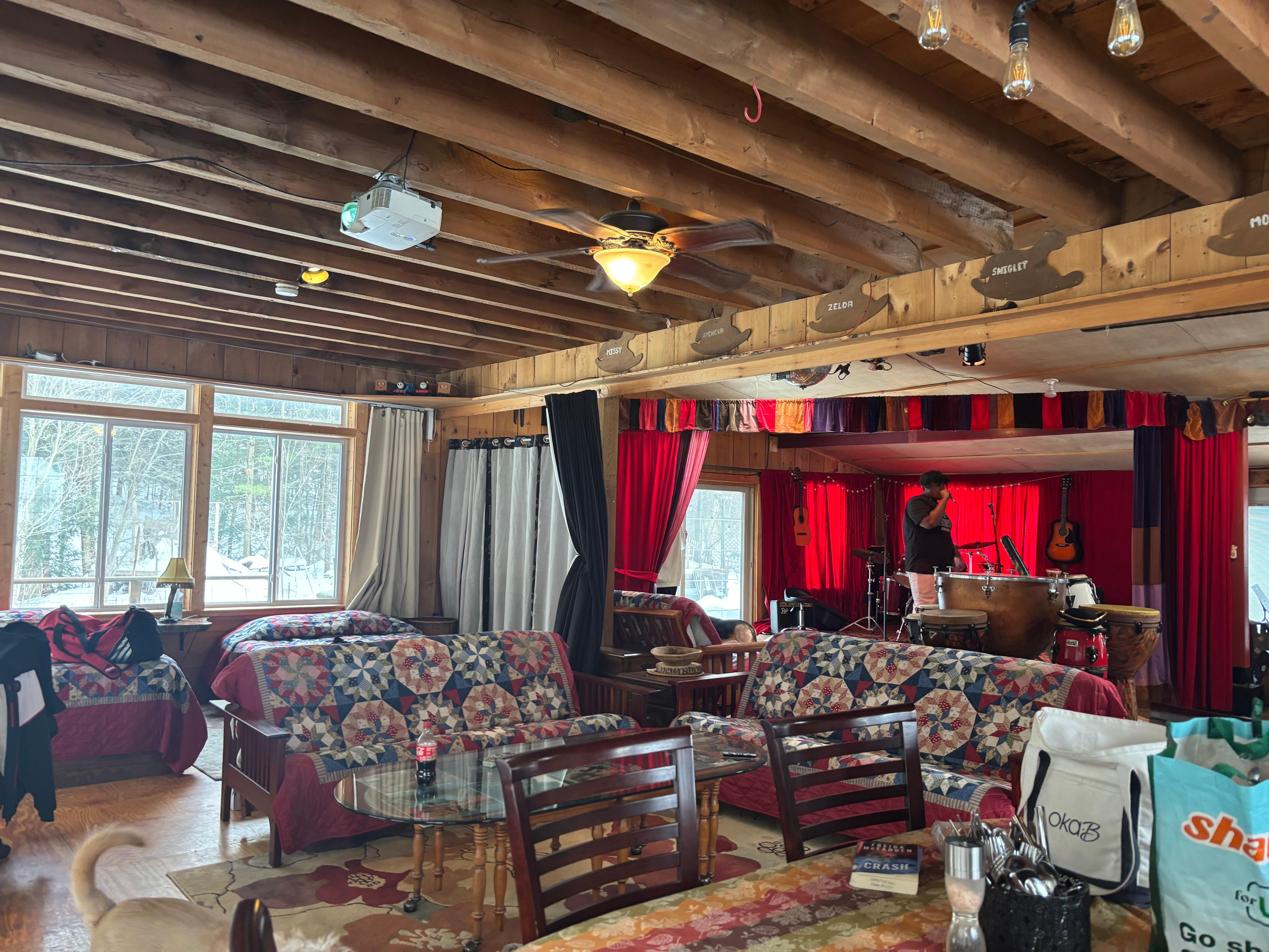 We came too Easthampton to visit with our life long friend, who lives there, and we wanted to be close to her place. This was not our usual VRBO choice, but it looked interesting and it proved to be a fabulous experience. It is full of musical instruments, a stage with lights and a real disco ball! It is a large space with two beds with good mattresses (king and queen) and three large fold-out sofas, a large dining table, well-equipped kitchen, full bathroom with large bathtub and shower, a washer and dryer, and a arge outdoor deck with many high cocktail tables and chairs, on a large piece of property. It is a great space for musicians or for any group or individual hosting a retreat or family visit. John also has put in a lot of work and pays attention to detail. He is available and communicative when needed. His place is clean, convenient to downtown Easthampton and memorable.