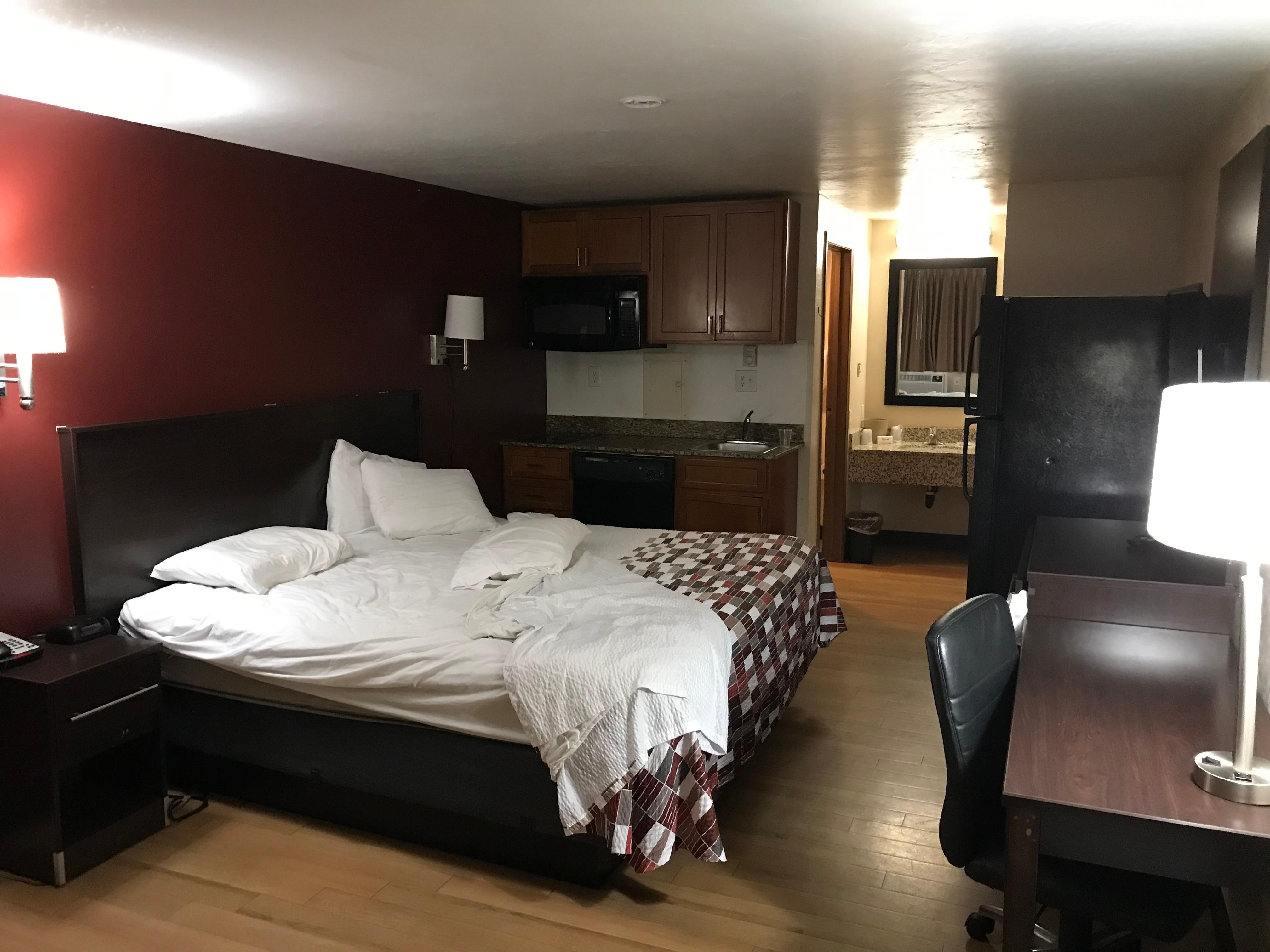 We didn't end up staying. The room looked nothing liked the pictures and the door had a broken lock. They're we're people smoking pot right outside our room and the dumpsters around the property we're overflowing with garbage. The room had a really weird smell as well. We didn't feel safe, and the room felt unclean.