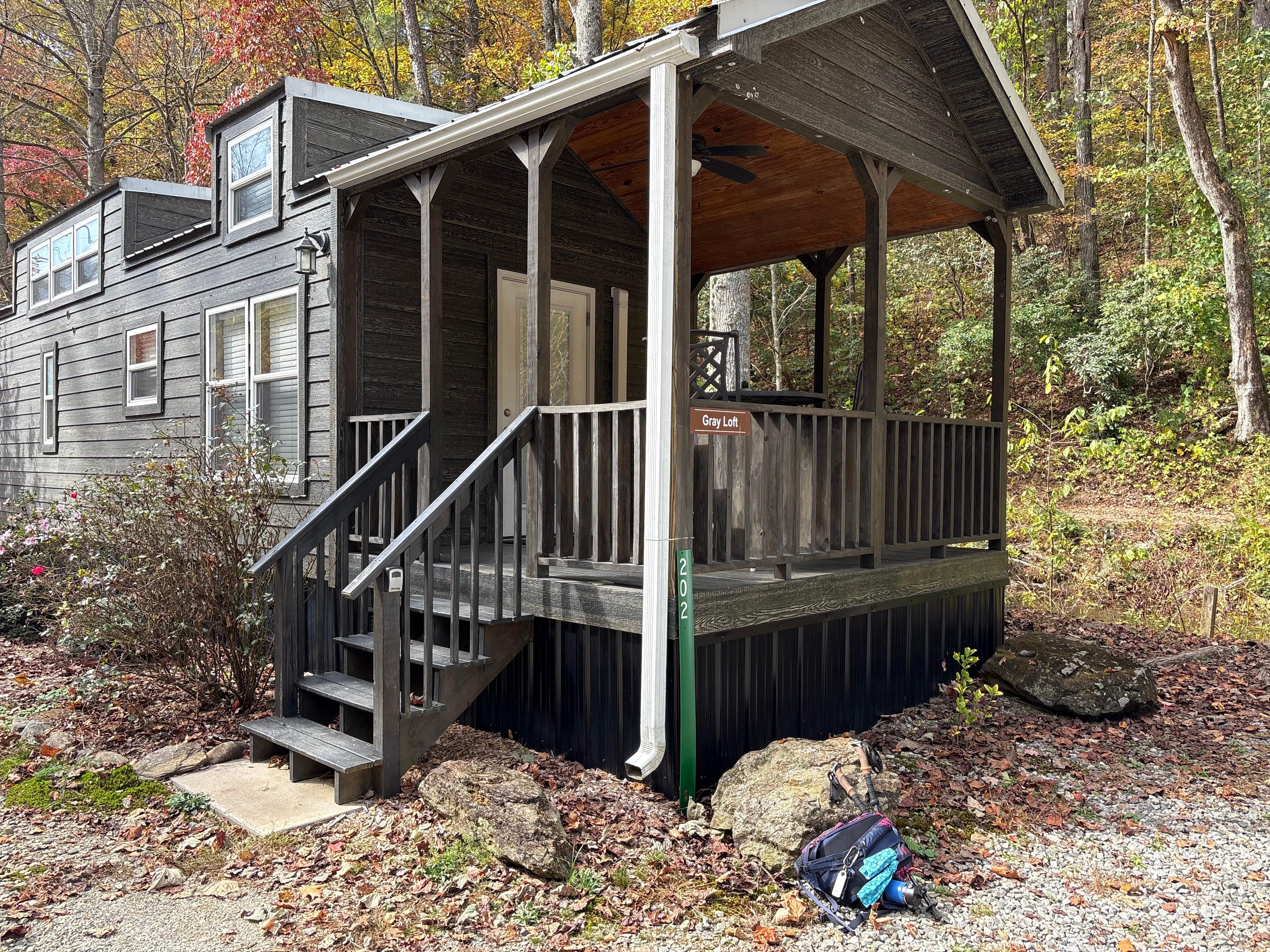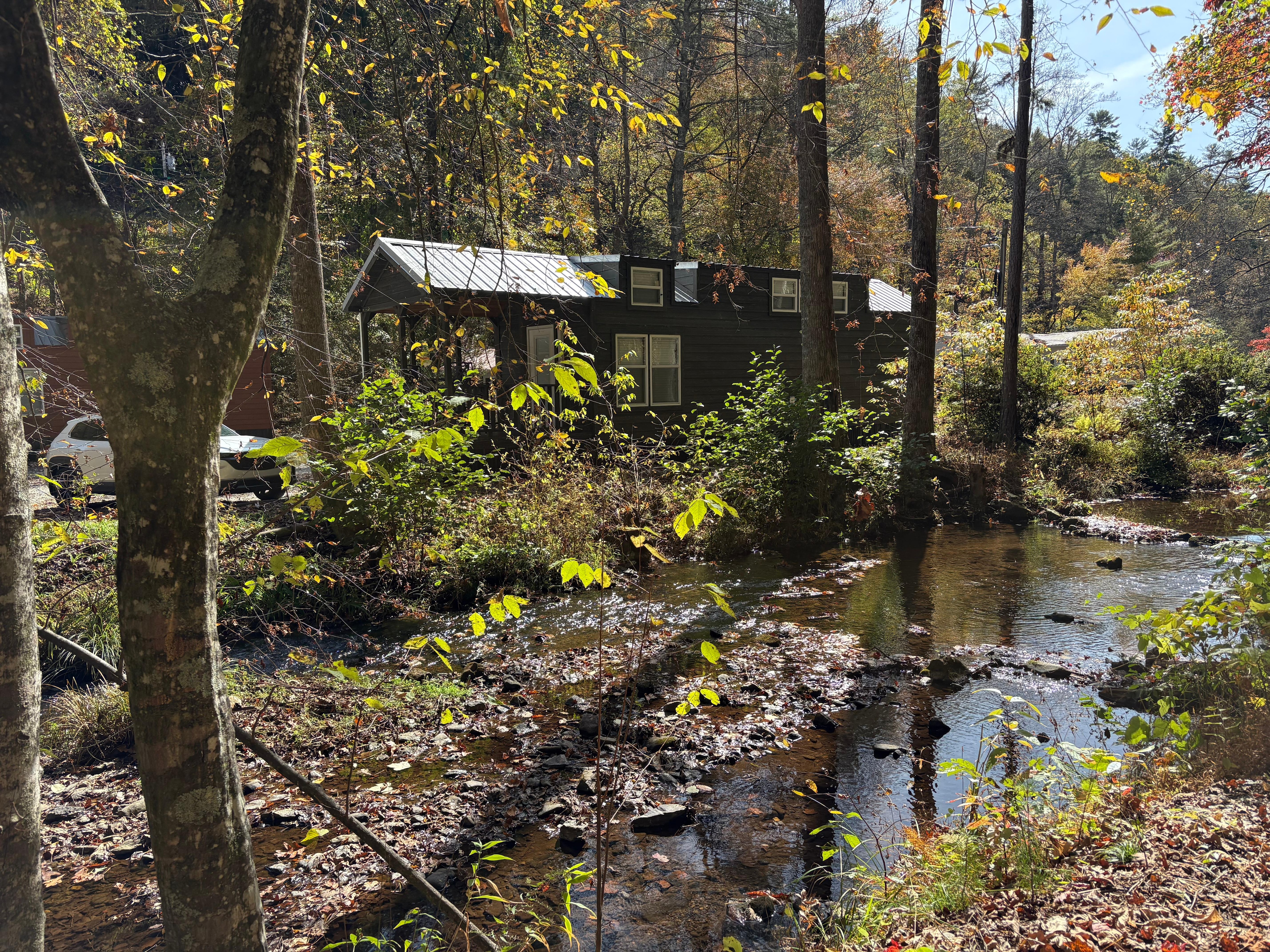 Though this is a great little tiny house and priced well, the listing does not tell the whole story. This collection of four houses / cottage is located less than 50 yds or so from a busy and very noisy main highway, with lots of large truck and related traffic. Though our unit was well built and well insulated the amount of noise from the hi way really ruined the experience for us. It really was not possible to sit outside due to the constant noise from the highway ( a major issue!!)Additionally photos in the list show a trout filled stream in back of the unit but there were no fish to be seen this trip (one reason we picked this spot) Perhaps the fish die off during the warm summer months? Additionally there is a super bright yard light (on all night) that flooded our bedroom at night (even with venetian blinds closed). Light blocking shades or drapes are really needed. All in all the stay was just OK and we would not stay here again in the future.
