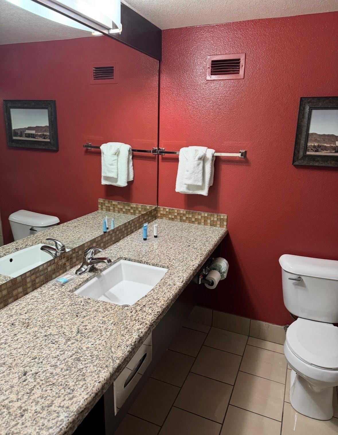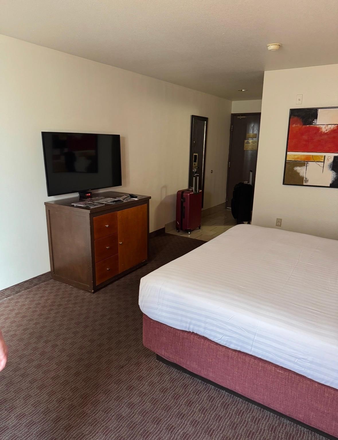 Room is an average motel style of a room. Our room in particular needs some updating in the bathroom. You can also tell that they use to allow smoking and even thought we were in a non smoking room you could tell they were covering it up with some type of air fresher. But what we were in town for it worked for us. The bed and ac were the best things.
