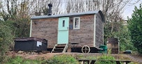 No, there aren't any cabins with balconies at Apple hut, romantic shepherd hut retreat with log burner, hot tub, pet friendly!.