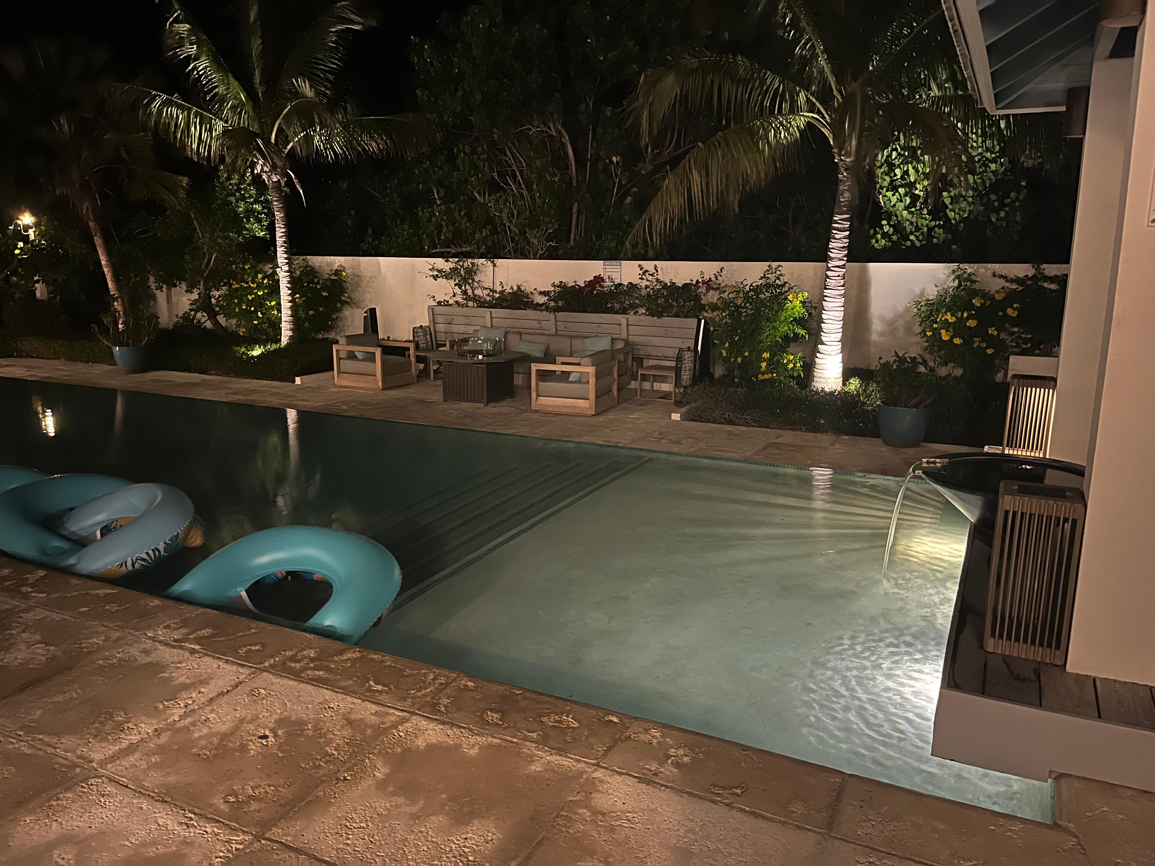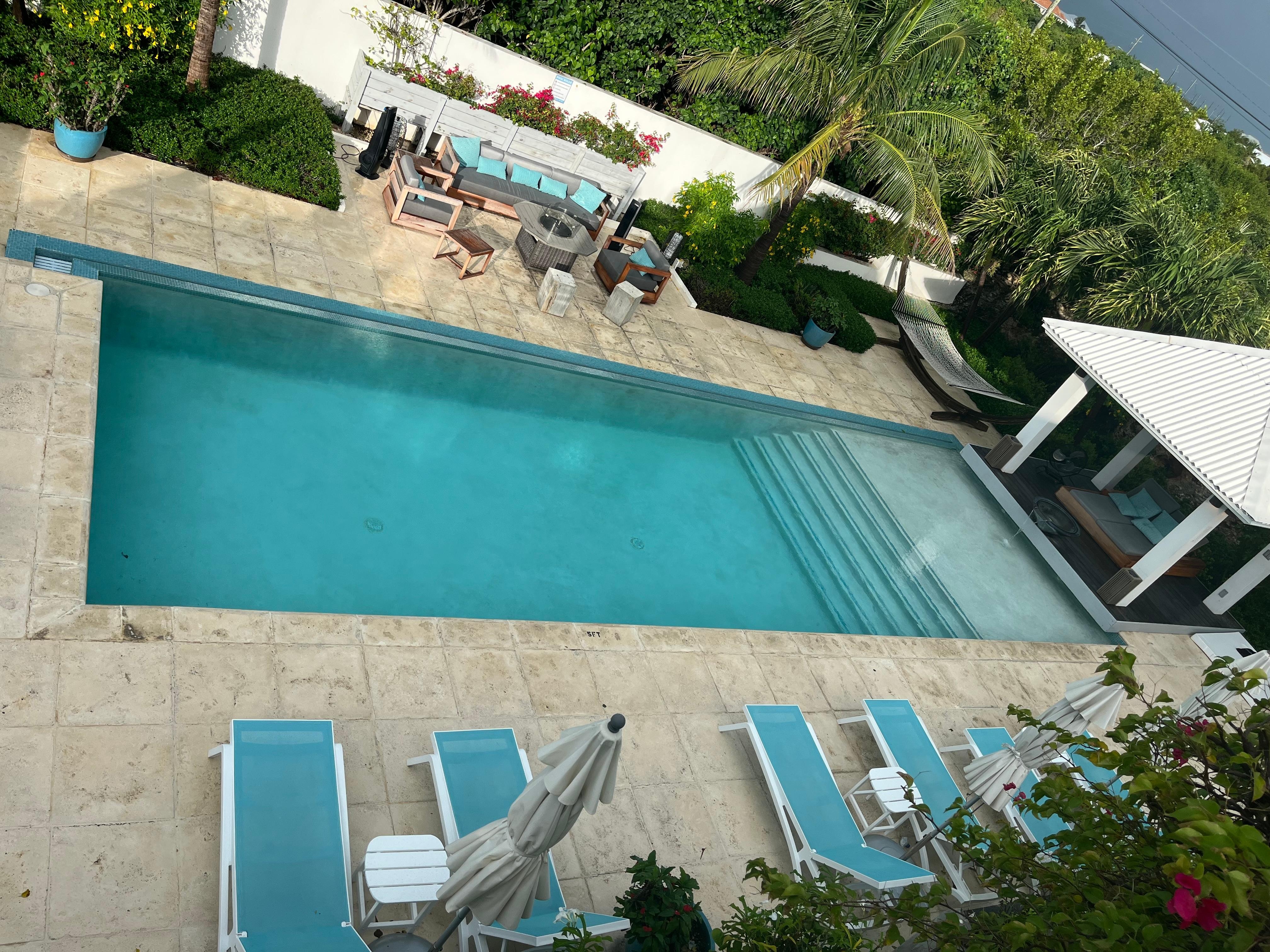 Las áreas de estar al aire libre de 2200 pies cuadrados se centran en la piscina de borde infinito de 40 x 14 con áreas poco profundas y profundas para que todos disfruten. Por la noche, la piscina cobra vida con impresionantes luces de colores. La cabaña cubierta contigua cuenta con una tumbona doble y 8 tumbonas individuales rodean la piscina, agrupadas bajo sombrillas. Una hamaca se encuentra a la sombra de las palmeras, y una gran zona de asientos de sofá rodea una mesa de fuego. Una mesa de comedor al aire libre tiene capacidad para 8 personas debajo de la cubierta sombreada de una cubierta del piso superior que ofrece vistas al océano y vistas panorámicas de 180 grados de los alrededores. La cubierta superior mira hacia el oeste y es el lugar perfecto para ver la puesta de sol sobre el océano cada noche. El paisaje de la villa presenta 15 variedades diferentes de palmeras tropicales, de ahí el nombre de Palm Jewel, rodeado de exuberantes plantas nativas.