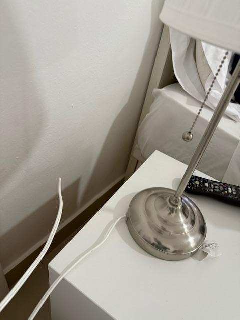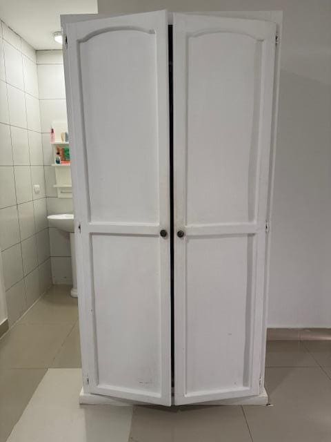 Room condition was poor from the start. The closet was dirty and damaged (holes) and there were no hangers. There was no proper mirror in the room—only a very small vanity mirror by the sink. The electrical outlets were mostly broken, and the only usable ones were one in the kitchen and one near the vanity. They even placed a lamp on the table that was essentially decorative because there was no outlet to plug it into. The refrigerator looked extremely old (like from the 1990s) and had visible rust.