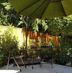I stayed here for about 3 weeks for work. The apartment is fully stocked with all the essentials (kitchen utensils, linens, spices, etc.) The website says their isn't A/C, but there is a unit A/C in the living room which worked wonderfully. I did not have the opportunity to enjoy the private patio area, but it was available with a nice bistro set. I would definitely recommend staying here.