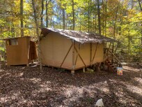 Inside you will find a comfy custom-made Queen bed and Twin bunk beds, custom made table for two, a kitchen with running water and a propane stove, stocked with the basic necessities. (Note; if the weather is going to drop below freezing at night water will not be turned on during spring or late fall due to pipes and water heater freezing up.)All you'll need to bring is your food and a cooler. The outside covered porch/deck has chairs to take in the peaceful views while sipping coffee in the mornings or just enjoy a quiet evening under the stars. An enclosed outdoor bathroom is just right outside the tent, with hot shower and a toilet loo. The logs by the fire pit, with plenty of firewood, invite you to sit and tell campfire stories and roast marshmallows while creating new memories. The trail then leads to the water, where you can enjoy a trip on the canoe and paddle board (provided for you), lay in the hammock or fish in the clear waters of Douglas Lake.