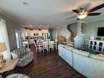 Overall the property was in very good shape. We arrived late at night we had given the property manager, Bob, a heads up and he had gone to the house to turn in some outside and inside lights. The beds were very comfortable. The hot water on the 4th floor seemed to run out quickly after a shower and shampoo. Maybe the thermostat needs to be turned up a little. We used 4 of the 5 bedrooms and everyone was comfortable. I must apologize that after we had left and locked up the house to head to the airport. My sister who was driving home, called me and said she forgot and left a casserole dish and knife soaking in the sink. I meant to call Bob when we got to the airport but unfortunately I forgot. Sorry to the cleaning team. I would suggest that it might be time to have furniture in the Livng Room cleaned, it is showing. Overall we really enjoyed our stay and would definitely consider renting this property again. The morning sunrises are beautiful and the sound of the ocean waves is soothing.