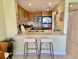 Los cambios recientes incluyen todos los electrodomésticos de acero inoxidable en la cocina junto con hermosas de granito blanco encimeras y un cocinero superficie superior plana. La cocina es muy funcional con un tamaño completo nevera, estufa, el horno de microondas gama y un lavavajillas para su conveniencia. También da a la / área y salón comedor a la derecha de la playa! La mesa de comedor con capacidad para cuatro con dos asientos adicionales en la barra de desayuno. El sofá de cuatro asientos y se dobla como una cama desplegable de tamaño completo para los niños.