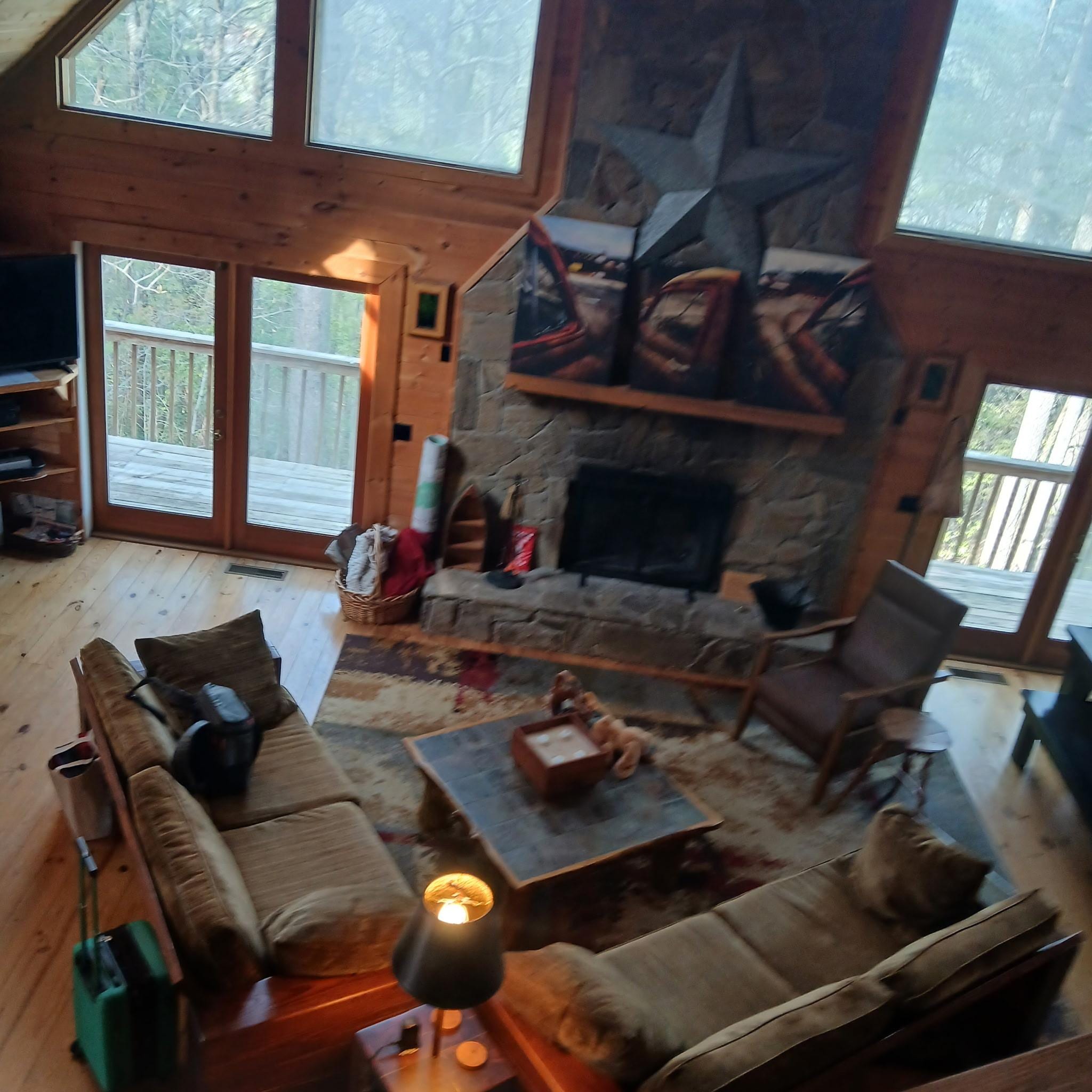 The all wood interior of the cabin (not an inch of sheet-rock here!) has 2 bedrooms, a sleeping loft and two large bathrooms. Each bathroom has double sink vanities. It comfortably sleeps 6. (One king bed, 1 queen bed and 1 double size futon in sleeping loft.) Washer and Dryer are available upon request. The cabin is decorated in a rustic-industrial-contemporary style.
