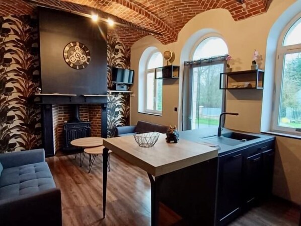 Couples staying at this apartment will appreciate amenities like a fireplace and a kitchen as well as a garden.