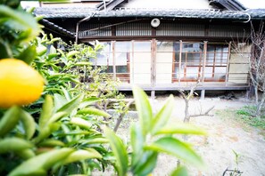 Un espacio privado en una casa tradicional japonesa en una tranquila zona residencial.