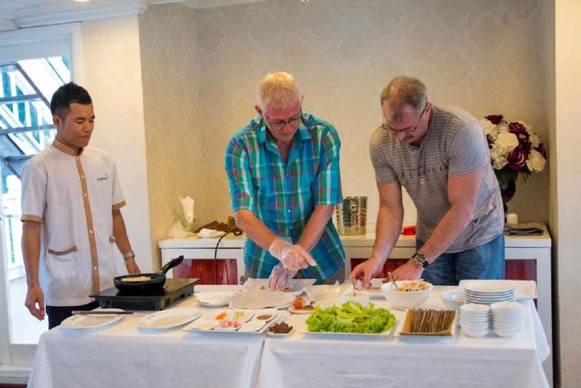 You will then have the afternoon at your leisure to relax, sunbathe, or kayak around the Bai Tu Long Bay landscape. Following your leisure time, you will join a cooking class on-board as hosted by your chef, before dinner is served at 7:00PM. The rest of your evening will be yours to spend at your leisure, you can enjoy chatting at the bar, relax in your room or enjoy some night fishing before spending the night on the boat.