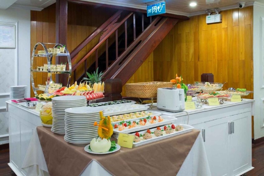 At 12:30PM, you can enjoy a welcoming drink and cruise briefing before beginning your cruise. You will then sit down for lunch at 1:30PM, as you cruise along and admire the fascinating rock formations of Bai Tu Long Bay.