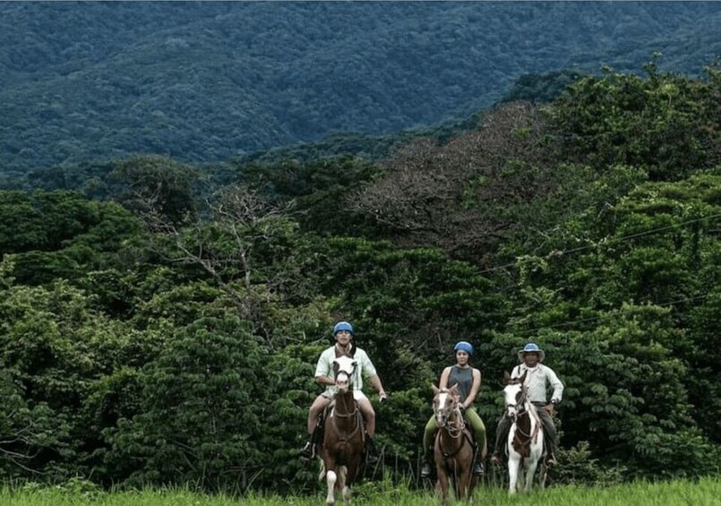 Adventure follows with an exhilarating zipline experience featuring multiple cables that soar above the forest canopy, offering panoramic views of Guanacaste’s landscapes and the surrounding volcanic area. Continue with a guided horseback riding tour through scenic trails, followed by a relaxing tractor ride across the property.